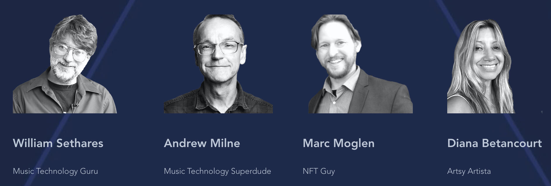 Andy Milne is a Senior Research Fellow of Music Cognition and Computation at Western Sydney University, where he studies the interactions between musical perceptions and algorithmic processes. Bill Sethares is a professor of engineering and a music theorist who has pioneered the study of the interactions between musical timbre and tunings. Together with NFT thought leader Marc Moglen, and internationally exhibited artist Diana Betancourt, we are aiming to introduce XronCircles to a wide audience and to generate a collection of perceptually-compelling algorithmic musical works together with dynamically-synchronized visualizations.